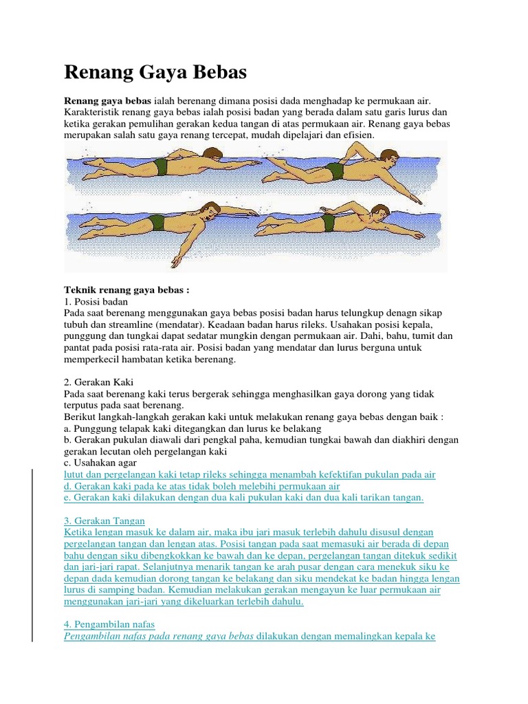 Kegiatan renang sendiri merupakan aktivitas tubuh yang dapat dilakukan dengan berbagai macam gaya ada gaya dada gaya punggung gaya kupu-kupu dan gaya bebas. Tehnik buat lakukan berenang dengan gaya bebas. Jika dibandingkan dengan jenis renang yang lainnya maka renang gaya bebas merupakan jenis renang yang membuat tubuh bisa melaju lebih cepat.
