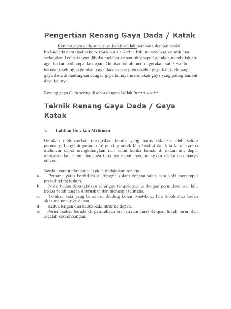 Seperti yang sudah di terangkan pada awal kalimat renang gaya dada dapat disebut juga sebagai renang gaya katak karena renang. 1122021 Renang gaya dada sering juga disebut renang gaya katak. Tenaga yang dikeluarkan untuk renang gaya ini tidak terlalu besar kecuali untuk perlombaan kita harus.